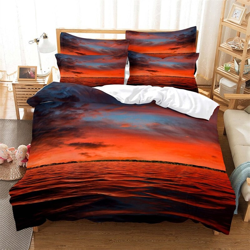 With the colorful feature of water flow, sunrise, and flowers are roused prints, this bedding material is perfect for decorating your rooms. This Flowers, Water Flow Print Duvet Cover Sheet Bedding Set is sewn using a double needle through which the edges are perfectly knitted. It is designed by 3D digital printing.