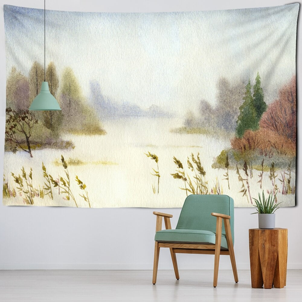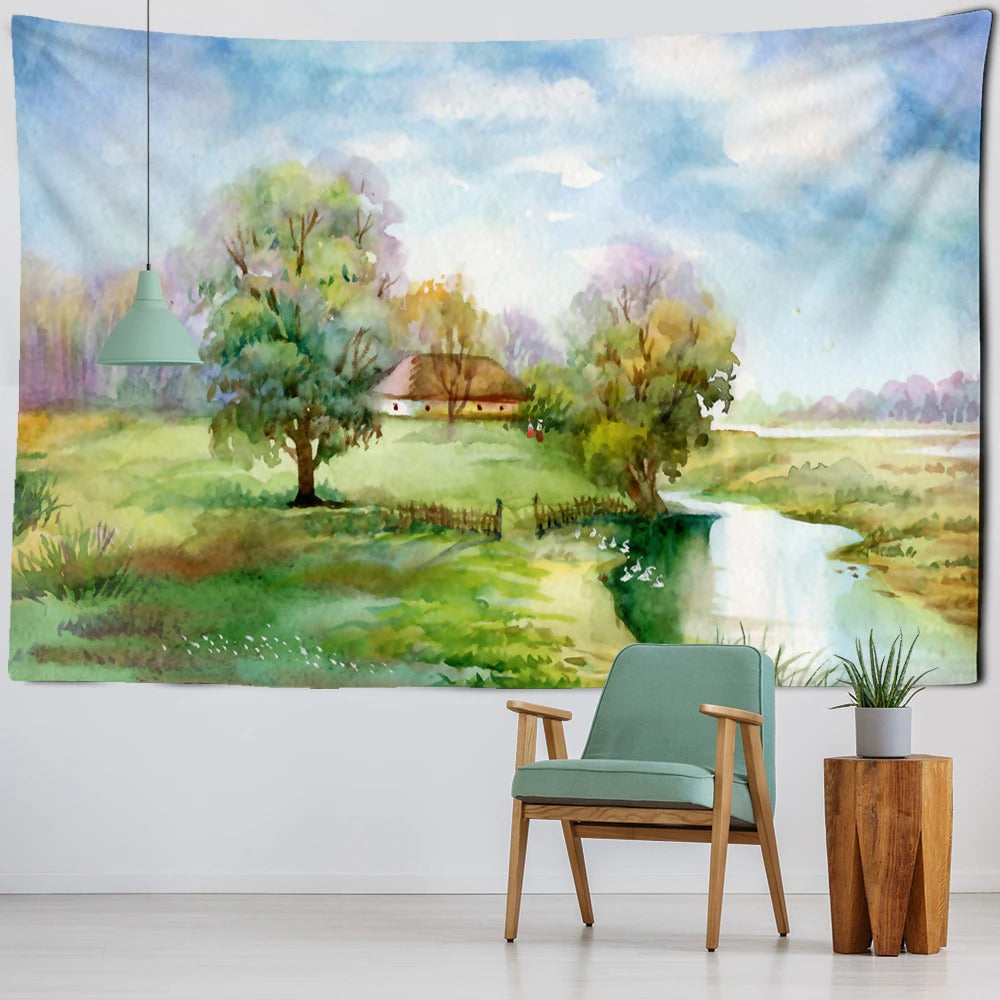 Watercolor Landscape Tapestry Wall Hanging Tapis Cloth has exquisite colors and clean finishing, making it a fantastic focal point for any room. These high-quality tapestries are intended to add a fashionable touch to your living room, hallway, or bedroom.