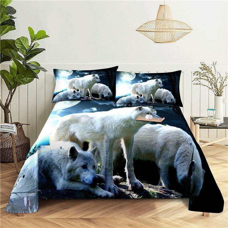 This Wolves Print Bedding Set is the perfect way to upgrade your bedroom. With a bold and modern design, this bedding set will turn heads. A dark, yet soft wolf print covers the bedding set in a whimsical pattern. It is made of 100% polyester and is machine washable. This bedding set is perfect for a bed or as a gift for a new home.